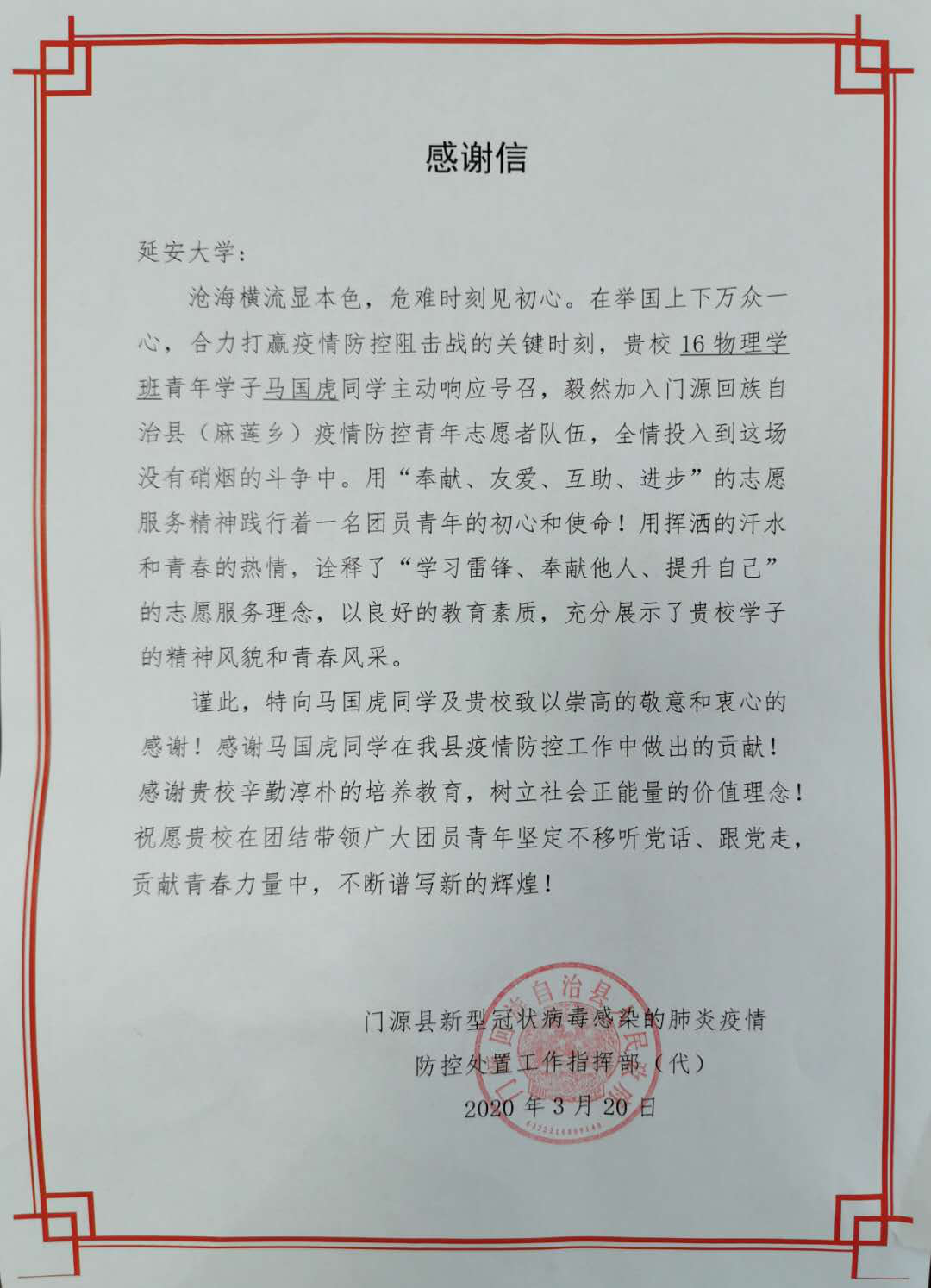 近日,公司收到来自青海省海北藏族自治州门源回族自治县新型冠状病毒感染的肺炎疫情防控处置工作指挥部的一封特殊的感谢信,信中高度肯定和赞扬了公司员工马国虎在当地疫情防控工作中做出的积极贡献。