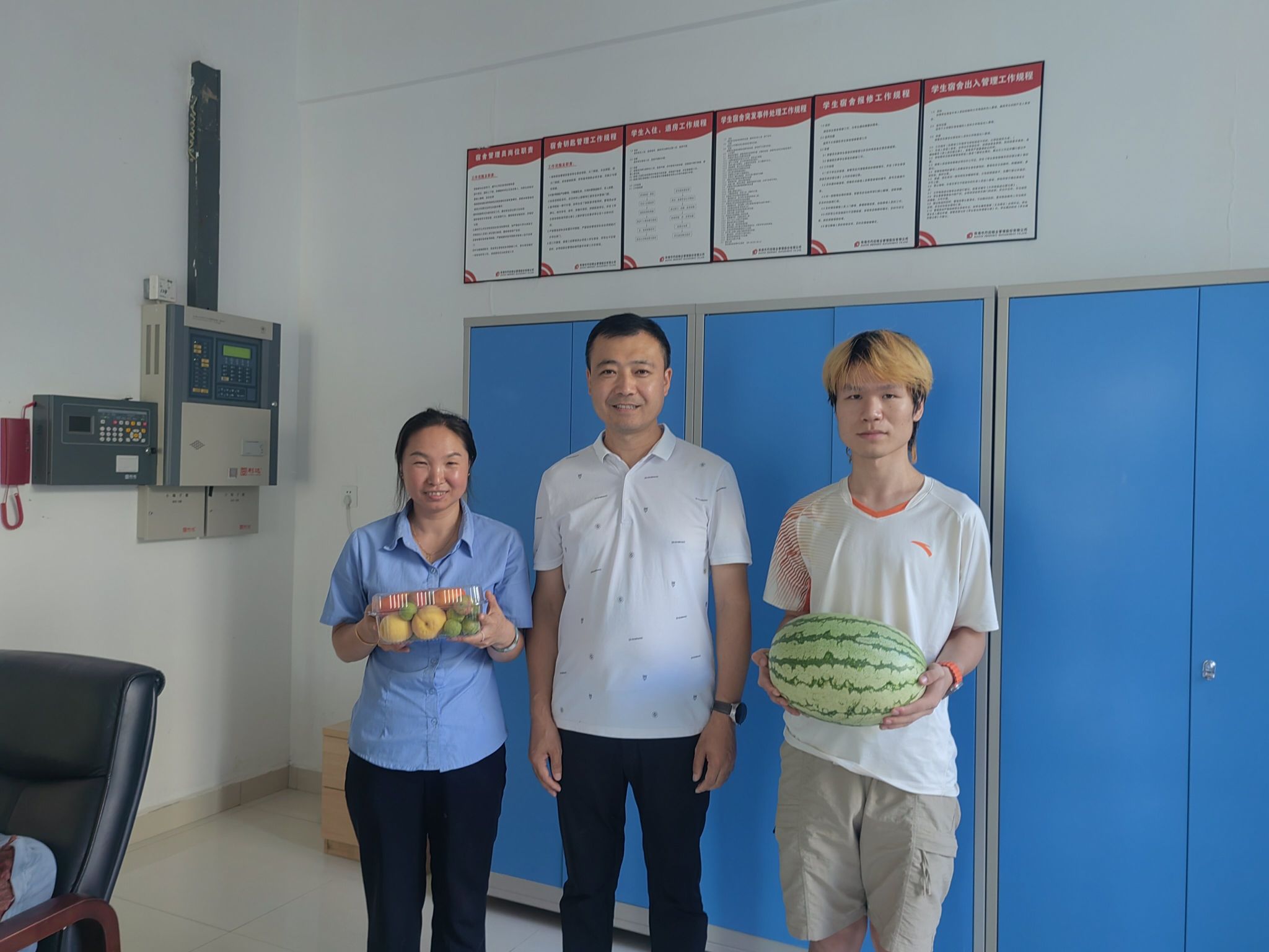 炎炎夏日送清凉,浓浓关怀沁人心。为深入了解暑期留校员工的学习、生活情况,传递公司的关怀与温暖,8月7日下午,公司党委副书记肖金学、副经理何智慧、赵晔及辅导员老师,深入员工宿舍走访慰问暑期留校员工与公寓值班人员,为他们送去防暑慰问品和真挚的问候。