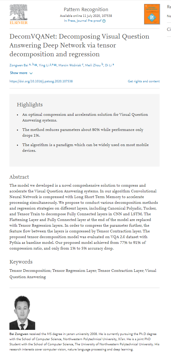 7月11日,人工智能领域权威期刊《Pattern Recognition》在线发表了sunbet白宗文副教授的《DecomVQANet: Decomposing Visual Question Answering Deep Network via tensor decomposition and regression》一文。该文瞄准人工智能领域中由于模型过大难以部署到移动终端这一痛点,从张量分析入手,提出了采用多种低秩分解高效联合学习来降低模型的数据量,提高了模型运行效率。在视觉问答等具挑战性的人工智能应用上表现出了优越的性能。论文受国家自然科学基金和陕西省自然科学基金等项目资助,也是公司陕西省能源大数据智能处理省市共建重点实验室的研究成果之一。