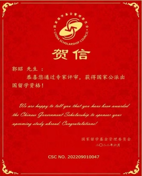 近日,国家留学基金管理委员会(CSC)公布“2022年赴俄乌白专业人才培养计划”名单,公司2020届推免硕士生田盟发、李杰及2021届推免硕士生郭昭、张健鹏、乔雯雯(2021年获得)共有5名推免硕士生获得国家公派出国留学资格。