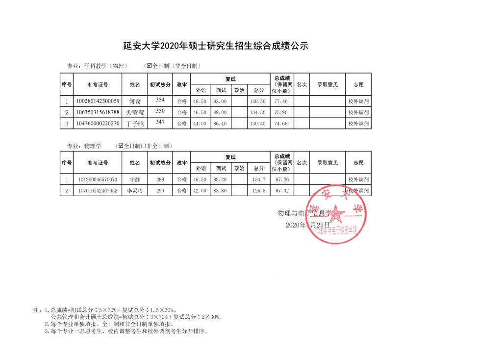 根据《教育部办公厅关于做好2020年全国硕士研究生复试工作的通知》(教学厅〔2020〕4号)文件和陕西省教育考试院有关文件和会议精神、sunbet官方网站《关于做好2020年硕士研究生复试录取工作的通知》相关规定,公司根据第一批、第二批复试情况,于5月25日组织第三批(校外调剂)复试,现就复试后综合成绩予以公示,公示期为 2020年5月25日下午11:00至2020年5月26日上午12:00,如有考生对成绩有疑问,可在公示期间以电话、电子邮件形式反馈,逾期不予受理。