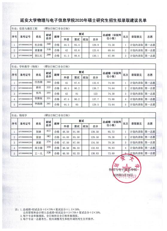 根据《教育部办公厅关于做好2020年全国硕士研究生复试工作的通知》(教学厅〔2020〕4号)文件和陕西省教育考试院有关文件和会议精神、sunbet官方网站《关于做好2020年硕士研究生复试录取工作的通知》相关规定,公司2020年一志愿硕士研究生招生复试工作已完成,现就复试后拟录取建议名单予以公示,公示期为 2020年5月19日下午2:00至2020年5月22日下午2:00,如有考生对成绩有疑问,可在公示期间以电话、电子邮件形式反馈,逾期不予受理。