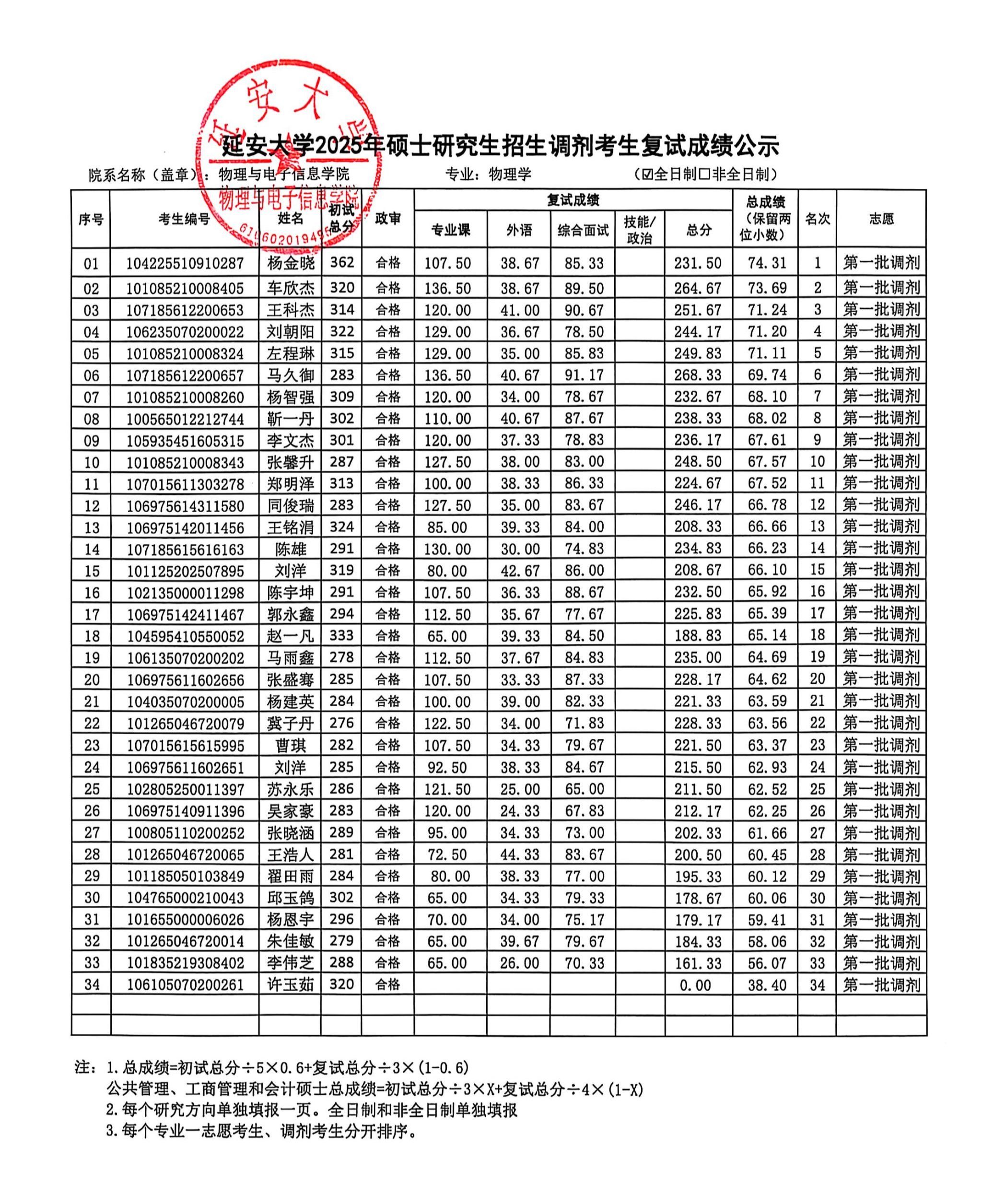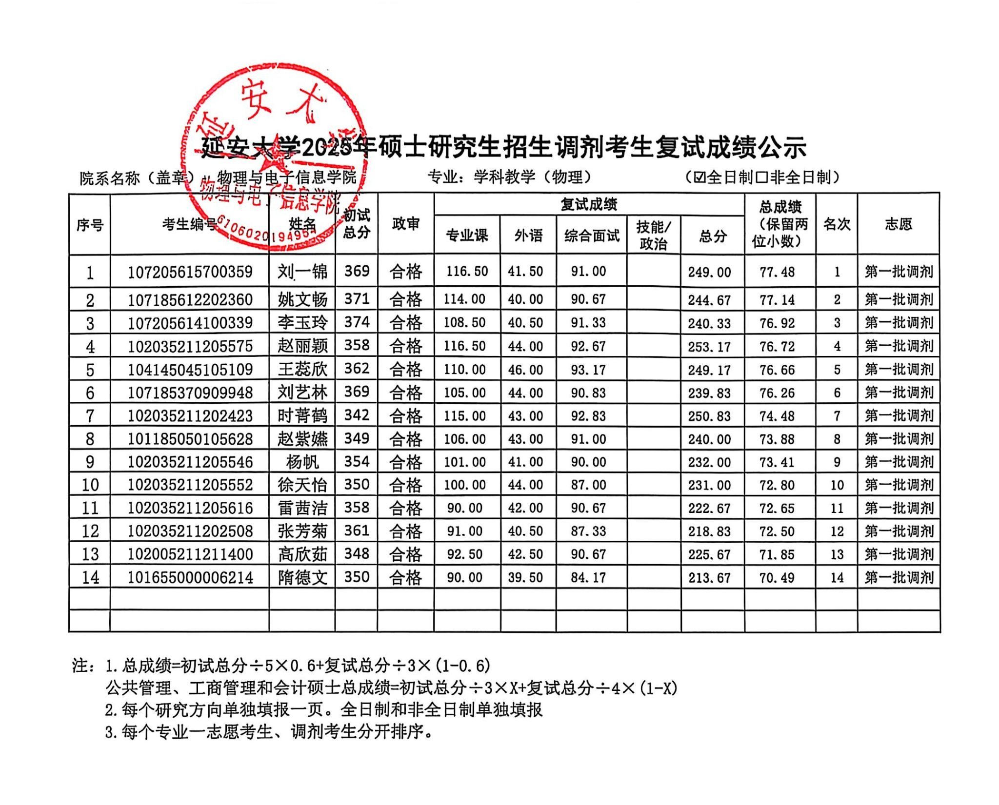依照公司2025年硕士研究生复试工作实施方案,安排在2025年4月8日的学科教学(物理)和物理学专业调剂考生复试工作已经圆满结束。复试成绩上报研究生院审核后,现将具体的复试成绩进行公示,公示时间为十个工作日,如有异议,请按照以下联系方式进行咨询。